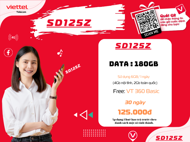 Gói cước SD125Z Viettel là một trong những gói cước phổ biến của Viettel với giá cước hấp dẫn chỉ 125.000 đồng. Gói cước này dành cho thuê bao di động trả trước Viettel và mang đến cho bạn lượng data 4G tốc độ cao, thích hợp cho việc duyệt web, xem video, nghe nhạc và sử dụng các ứng dụng trực tuyến. Hãy cùng tìm hiểu chi tiết về gói SD125Z Viettel và cách đăng ký để tận hưởng lợi ích của nó.